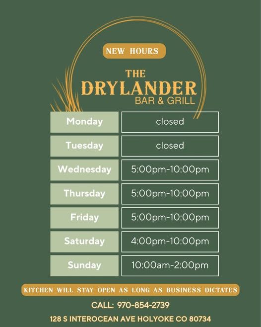 Welcome to The Drylander, one of the best places to eat and drink in Holyoke, Colorado! Family friendly bar and grill with 6 TVs to watch the games! Full service restaurant and bar.